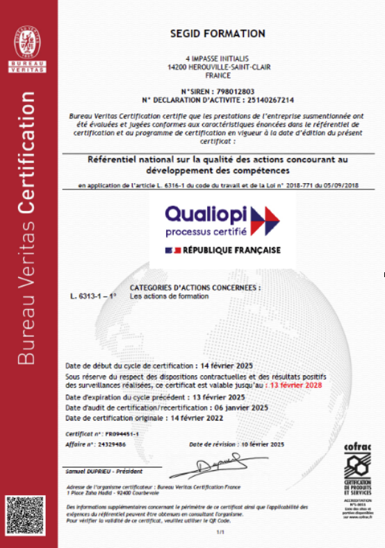 Depuis décembre 2021, la qualité de nos actions est officiellement reconnue par la certification QUALIOPI, délivrée au titre de la catégorie actions de formation.